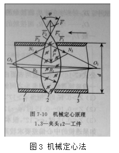 定心的方法很多,可以歸類為光學(xué)定心法、機(jī)械定心法、激光定心法、光電定心法。光學(xué)定心又可以分為透鏡表面反射像定心法、球心自準(zhǔn)反射像定心法、透射像定心法和電視定心法等。簡單介紹一下機(jī)械定心法,當(dāng)透鏡處于非定心狀態(tài)時(shí),由于其邊厚不等,則透鏡受力不平衡。這時(shí)由彈簧產(chǎn)生的支反力,可分解成垂直于夾頭端面的夾緊力和垂直軸線的定心力(圖3)。