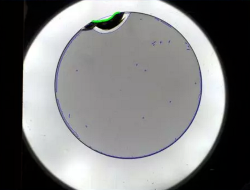 檢測效果圖中,藍色代表污漬等有問題的區(qū)域(精度為0.39mm);綠色代表透鏡缺損部分。檢測效率可達3秒/個,誤檢率低于0.1%。
