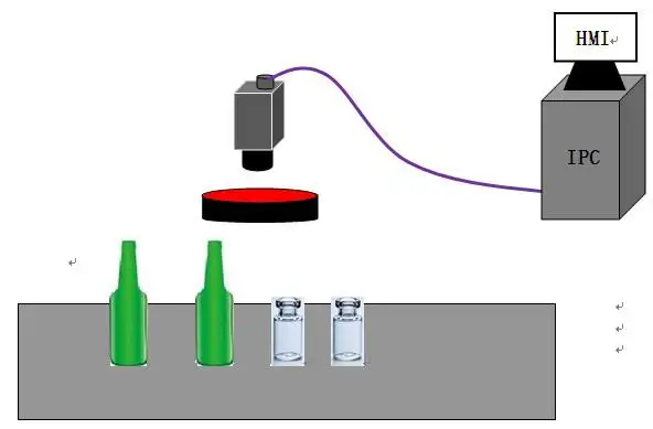 在生產(chǎn)線上安裝玻璃瓶瓶口缺陷檢測系統(tǒng),玻璃瓶流入視覺檢測工位時,通過觸發(fā)機器視覺傳感器拍得玻璃瓶瓶口圖片送入系統(tǒng),系統(tǒng)對所拍圖片進行提取分析并和設(shè)定的比較得知瓶口是否有缺陷,當檢測到玻璃瓶瓶口有缺陷時,系統(tǒng)發(fā)出聲光報警并發(fā)出停機信號。
