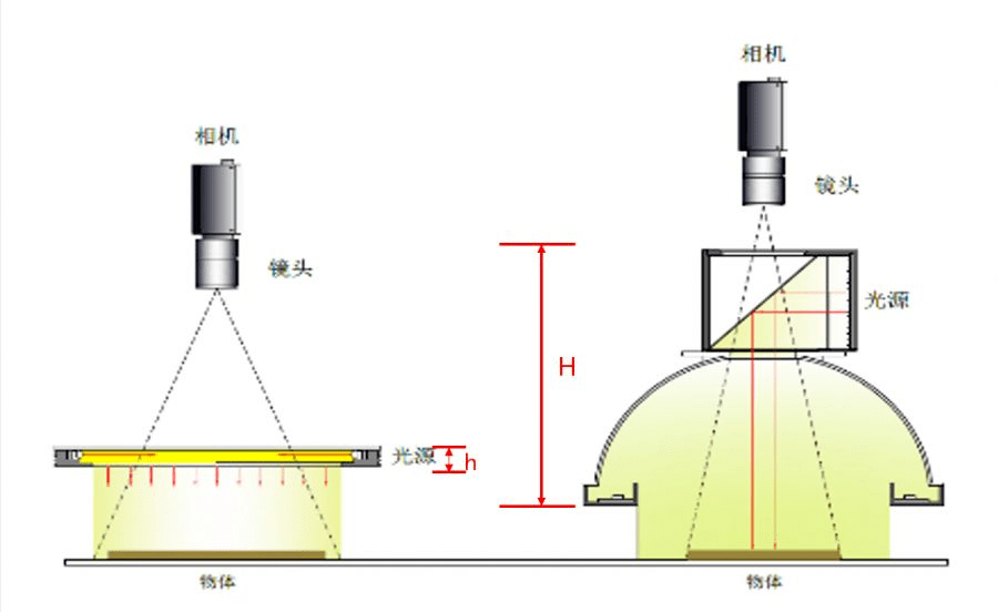 下圖為兩組光源的成像原理圖,左側(cè)為平面無(wú)影光源,右側(cè)為“圓頂+同軸”的組合光源。
