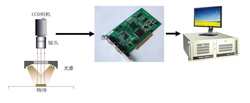 CCD 工業(yè)相機(jī)將待測(cè)目標(biāo)轉(zhuǎn)換為圖像信號(hào),通過定制的圖像數(shù)據(jù)處理系統(tǒng),將像素分布和亮度、顏色等信息,轉(zhuǎn)變成數(shù)字化信號(hào);圖像系統(tǒng)對(duì)這些信號(hào)進(jìn)行相應(yīng)的運(yùn)算來抽取目標(biāo)的特征,進(jìn)而產(chǎn)生檢測(cè)結(jié)果并依此控制現(xiàn)場(chǎng)設(shè)備的動(dòng)作。