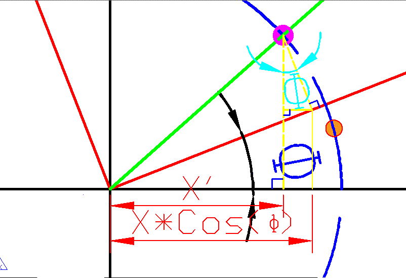 圖中我們很容易得到標注的兩個角度相等,新點的橫坐標X’等于下面尺寸標注的X*Cos(φ)-兩條黃色的垂線間的距離,而這段距離我們可以在紅色的新坐標系中很容易求出distance=Y * Sin(φ),所以很容易就得到了新點的橫坐標