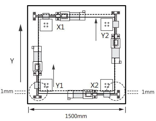 X1和X2不動作進(jìn)行計策,此時進(jìn)行Y方向移動1mm,因大臺面的原因,Y1和Y2共同進(jìn)行運動,讓整個臺面正確移動,不產(chǎn)生誤角度,定位準(zhǔn)確。