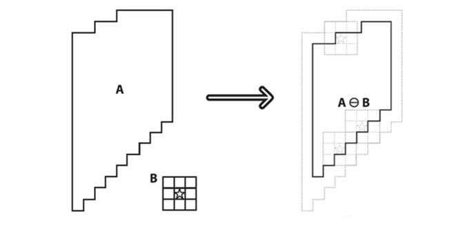 在數(shù)學(xué)形態(tài)學(xué)中,設(shè)A為(x,y)平面上一目標(biāo)區(qū)域,S為指定大小和形狀的結(jié)構(gòu)元素,定義位于坐標(biāo)(x,y)上的結(jié)構(gòu)元素S所標(biāo)識的區(qū)域為S(x,y),那么對于A的腐蝕結(jié)果可以表示為:腐蝕的原理:
