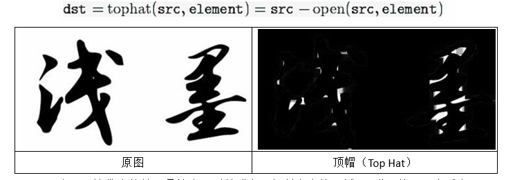頂帽運算(Top Hat)又常常被譯為”禮帽“運算。為原圖像與上文剛剛介紹的“開運算“的結(jié)果圖之差,數(shù)學(xué)表達式如下: