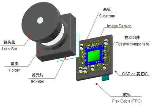 攝像頭模組主要由軟板排線(xiàn)(FBC),攝像傳感器/感光器件(Image Sensor/CMOS),紅外濾光片(IR Filter),基座(Holder),鏡頭組(Lens Set),基板(Substrate),音圈馬達(dá)(VCM),印刷電路板(PCB)等組成,其主要部件的主要功能分別為: