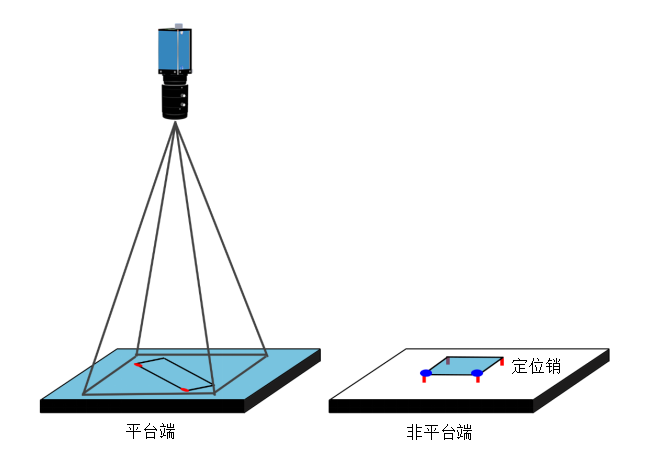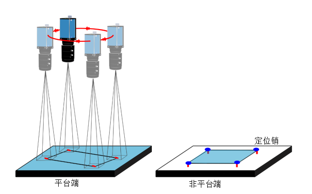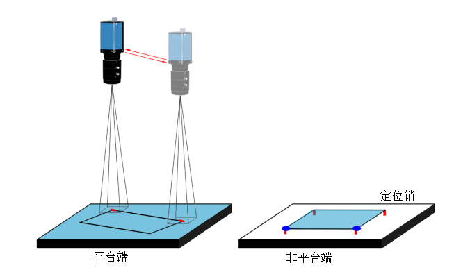 說明:四相機抓邊自對位模型中相機都是在平臺端。四個相機模型的四個相機分別拍攝平臺端矩形產(chǎn)品的四條邊。非平臺端上的產(chǎn)品通過定位銷或其他方式確保來料都是在相對固定的位置,平臺端的產(chǎn)品來料位置不固定。找出四條邊后根據(jù)糾偏算法找到偏移量,根據(jù)偏移量將平臺端的產(chǎn)品貼到非平臺端上。