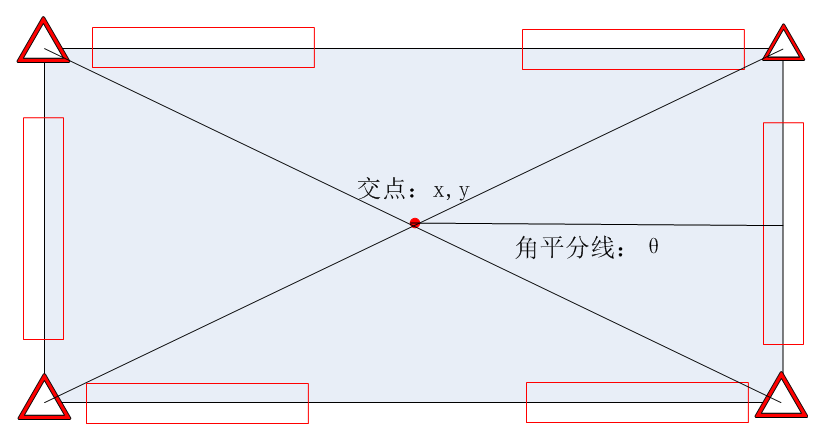 糾偏方法:四Mark對位會用到四個交點,通常是矩形的四個角點。如果客戶有特殊要求,可以按照客戶要求的Mark點進行對位。以矩形的四個角點為例:如上圖,通過直線擬合找到四條直線;找到四條直線的交點即矩形的四個角點;求出對角線的交點坐標定為(x,y);對角線形成夾角的角平分線的角度作為θ;x,y,θ與基準的差值為偏移量。