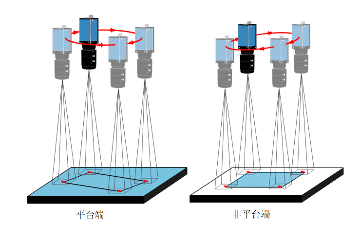 說明:平臺端和非平臺端來料位置都不固定,但Mark與產(chǎn)品的相對位置固定。四個Mark對應(yīng)矩形產(chǎn)品的四個角點。拍攝時確保四個Mark都在相機視野內(nèi)(通常是將產(chǎn)品抓起后再拍攝防止拍完再抓導(dǎo)致產(chǎn)品移動或變形)。根據(jù)糾偏算法找到偏移量。根據(jù)偏移量和兩端相機的映射關(guān)系將平臺端的產(chǎn)品貼到非平臺端上。