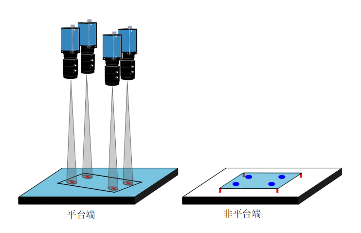 系統(tǒng)中可以使用兩個,三個或四個相機,每個相機都可以同時看到平臺端和非平臺端的對應Mark點(可以通過移動對位平臺,使得Mark點之間有一定的間隔,可以避免Mark點之間干涉)。