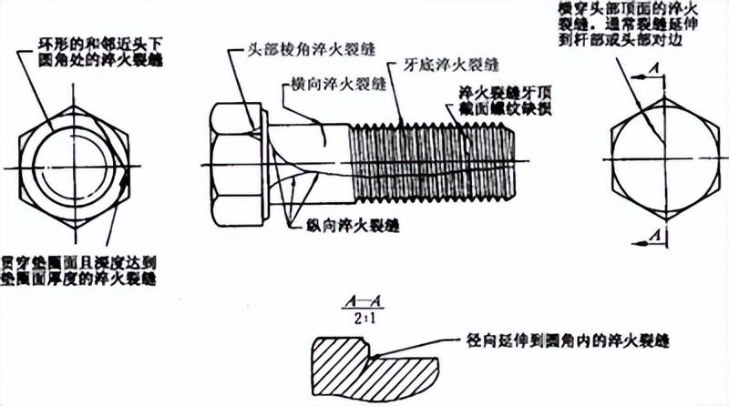 產(chǎn)生原因:在熱處理過程中,由于過高的熱應(yīng)力和應(yīng)變,都可能產(chǎn)生淬火裂縫。淬火裂縫通常是不規(guī)則相交、無規(guī)律方向的呈現(xiàn)在緊固件表面。檢測要求:任何深度、任何長度或任何部位的淬火裂縫都不允許存在。