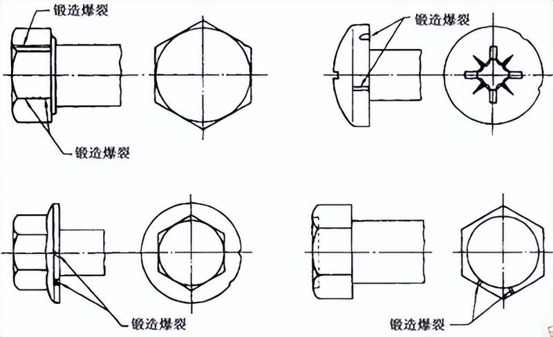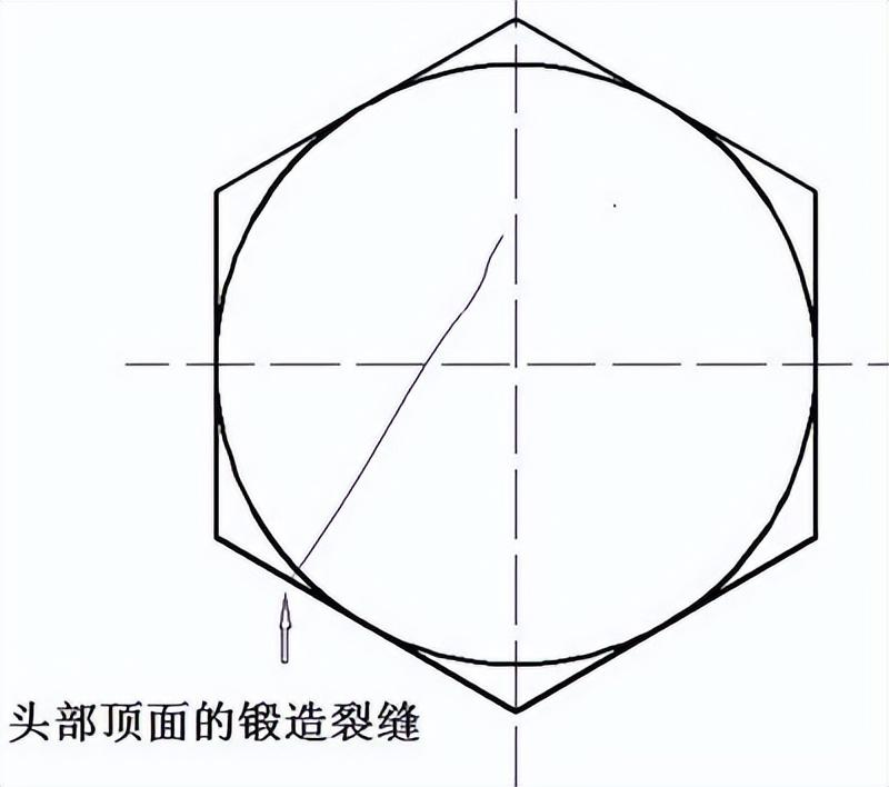 產(chǎn)生原因:在鍛造過程中可能產(chǎn)生鍛造爆裂,例如在螺栓和螺釘六角頭的對角上,或在法蘭面或圓周上,或在凹穴頭部隆起部分出現(xiàn)。檢測要求:六角頭及六角法蘭面螺栓和螺釘:六角法蘭面螺栓和螺釘?shù)姆ㄌm面上的鍛造爆裂,不應(yīng)延伸到頭部頂面的頂圓(倒角圓)或頭下支承面內(nèi)。