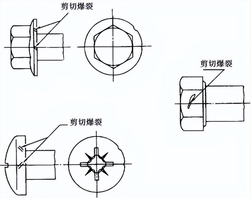 產(chǎn)生原因:在鍛造過程中可能產(chǎn)生剪切爆裂,例如在圓頭或法蘭面產(chǎn)品的圓頭或法蘭面的周圍出現(xiàn),通常和產(chǎn)品軸心線約成 45°。也可能產(chǎn)生在六角產(chǎn)品的對邊平面上。檢測要求:六角頭及六角法蘭面螺栓和螺釘:六角法蘭面螺栓和螺釘?shù)姆ㄌm面上的剪切爆裂,不應(yīng)延伸到頭部頂面的頂圓(倒角圓)或頭下支承面內(nèi)。對角上的剪切爆裂,不應(yīng)使對角寬度減小到低于規(guī)定的最小尺寸。
