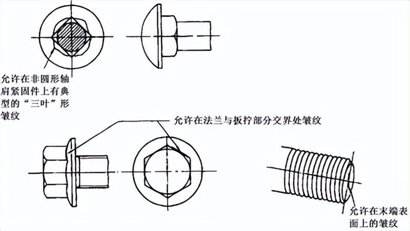 圓頭螺栓和螺釘及六角法蘭面螺栓:螺栓和螺釘及六角法蘭面和圓頭圓周上的剪切爆裂的寬度,不應(yīng)超過下列極限:≤0.08dc(或 dk) (只有一個剪切爆裂時) ;≤0.04dc(或 dk)(有兩個或更多的剪切爆裂時,其中有一個允許到 0.08dc 或 dk ,其中d ---螺紋公稱直徑;dc---頭部或法蘭直徑;dk---頭部直徑。