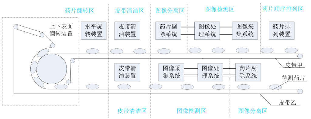 如圖上圖所示,藥片在傳送帶甲上由右向左運行,首先將待檢測的藥片裝入料斗,經(jīng)過藥片排列裝置將藥片排成一列,隨皮帶甲移動;當(dāng)藥片進入圖像采集裝置的視野范圍時,觸發(fā)圖像采集裝置,采集藥片圖像;將采集的藥片圖像傳輸?shù)綀D像處理裝置,對采集的藥片圖像進行分析處理,判別藥片是否有缺陷;將不合格藥片采用剔除裝置將其分別裝入到相應(yīng)的廢品收集器中;由于長期傳送藥片,傳送帶上殘留太多藥片灰塵時,啟用清潔裝置,及時清潔傳送帶;在傳送帶甲上,僅采集到了藥片一個表面的圖像信息(此處我們稱作藥片上表面信息),通過翻滾型的藥片翻轉(zhuǎn)裝置,翻轉(zhuǎn)藥片的上下表面,在傳送帶乙上,采用圖像采集裝置采集藥片下表面圖像信息,然后使用圖像處理裝置分析處理藥片圖像,并及時將不合格藥片剔除。