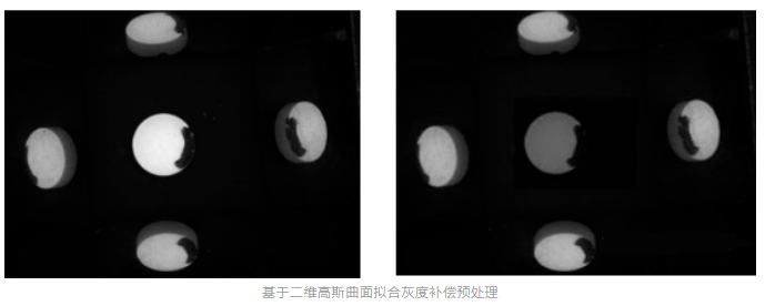 圖像灰度不均衡:藥品表面是一個曲度,通過反光成像獲取的邊緣藥片的光強度信息較低,所以邊緣藥片的灰度值會明顯低于中心藥片的灰度值。通過基于二維高斯曲面擬合灰度補償預(yù)處理算法,對圖像灰度進行修正。