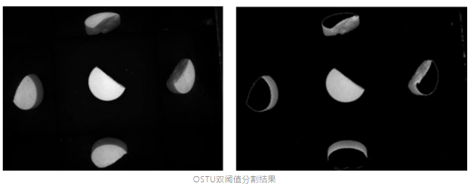 冗余信息過多:為了準(zhǔn)確地提取藥片缺陷特征,需要從藥片圖像中分離出藥片信息,其中要求得到的藥片信息包含藥片缺陷可能存在的任何區(qū)域,同時盡可能地減少藥片信息的冗余。采用OSTU雙邊閾值分割法對藥片圖像進行預(yù)分割。