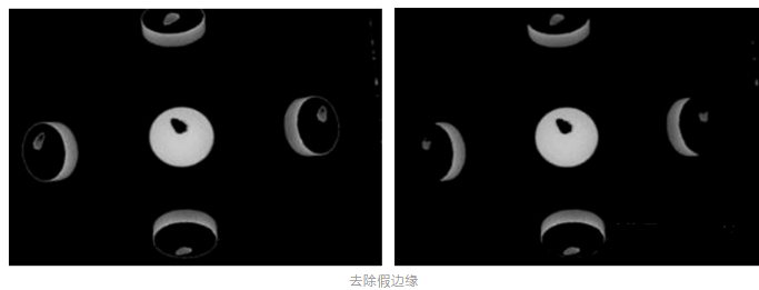 圖像邊緣修正:經(jīng)過OSTU雙閾值處理后,可以準(zhǔn)確分離出藥片信息,包括藥片上表面信息和藥片側(cè)面邊緣信息。與此同時,藥片圖像的邊緣藥片處出現(xiàn)了假邊緣,通過形態(tài)學(xué)方法去除圖像的假邊緣。