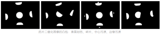 凸包(ConvexHull)是一個圖形學(xué)概念。給定二維平面上的點集,凸包就是將最外層的點連接起來構(gòu)成的凸多邊形,它能包含點集中所有點的。如下圖,藥片表面劃傷圖像和藥片中心污點圖像二值化后經(jīng)凸包運算,其中心藥片和標(biāo)準(zhǔn)藥片相同,對于藥片碎片和藥片邊緣污點圖像,其中心藥片的面積小于合格藥片。