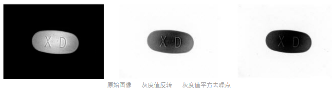 經(jīng)過灰度值反轉(zhuǎn)后的藥片圖像,沒有去除字符周圍的噪聲點,本文采用平方函數(shù)(Square)對藥片圖像進行映射,處理后的結(jié)果見圖C。由平方函數(shù)的性質(zhì)決定,經(jīng)過平方函數(shù)后,圖像白色區(qū)域的對比度增加,黑暗區(qū)域的對比度減少。對于藥片圖像,字符的特征比較明顯,藥片上的噪聲點減少。