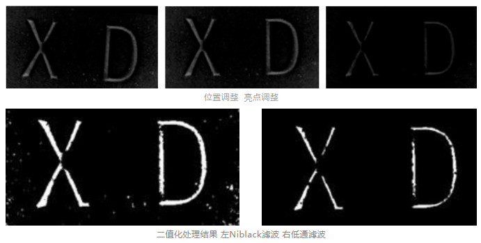 因為藥片是隨機放置的,所以需要對采集圖像上的字符進行調(diào)整。經(jīng)過掩膜法提取藥片字符區(qū)域,經(jīng)過亮度調(diào)整后,字符的噪聲減少了很多?,F(xiàn)通過二值法提取字符特征。最后再通過二值法提取字符特征。