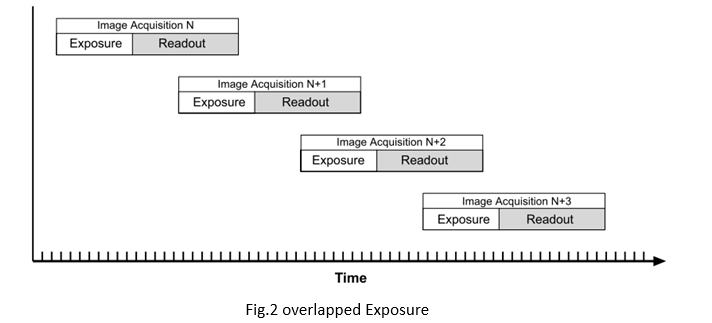 雖然非重疊(“non-overlapped”)的模式,可適合于許多情況下,但它并不是最有效的方式。為了提高相機(jī)的幀率,允許在下一幀圖像開(kāi)始曝光時(shí)候,將前一幀獲得的圖像數(shù)據(jù)讀出并傳送出去。相機(jī)“重疊”(“overlapped”)曝光的方式見(jiàn)Fig.2所示。