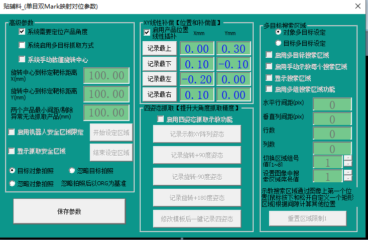 更新基準(zhǔn)位置是作為對(duì)位成功后前往貼輔料位進(jìn)行補(bǔ)償。更新后如有貼合不對(duì)的需注意下料方向是否正確,不正確可通過(guò)設(shè)備機(jī)械改變基準(zhǔn)位來(lái)調(diào)整,如補(bǔ)償方向反了,越來(lái)越大了,需到“運(yùn)行參數(shù)”“高級(jí)參數(shù)設(shè)置”里進(jìn)行“目標(biāo)X、Y對(duì)位取反”進(jìn)行一個(gè)取反。