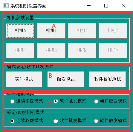 區(qū)域B: 相機模式切換,實時模式和觸發(fā)模式以及軟件觸發(fā)測試;軟件觸發(fā)測試中包換當前相機的幀率以及丟幀情況;