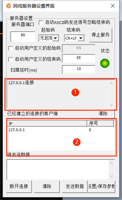端口參數:①可以看到連接、斷開、接收的數據