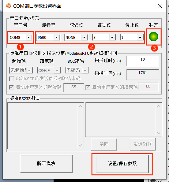①是串口號,要與PLC串口對上,②的設置要與PLC端口一致,③僅是代表端口是否打開,即使亮綠燈也不代表和PLC連接正常,修改①和②后要點擊右下角“設置/保存參數”保存參數