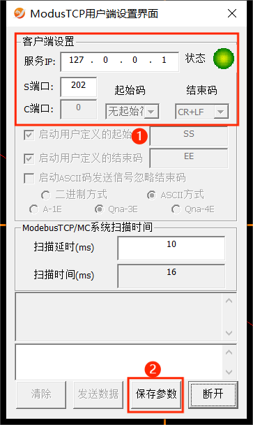 更改IP/端口、數據后需要點擊下面的“保存參數”后再進行操作