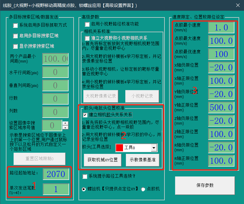 3:速度、限位設(shè)定:設(shè)置點(diǎn)膠速度、點(diǎn)膠相關(guān)軸的軟極限