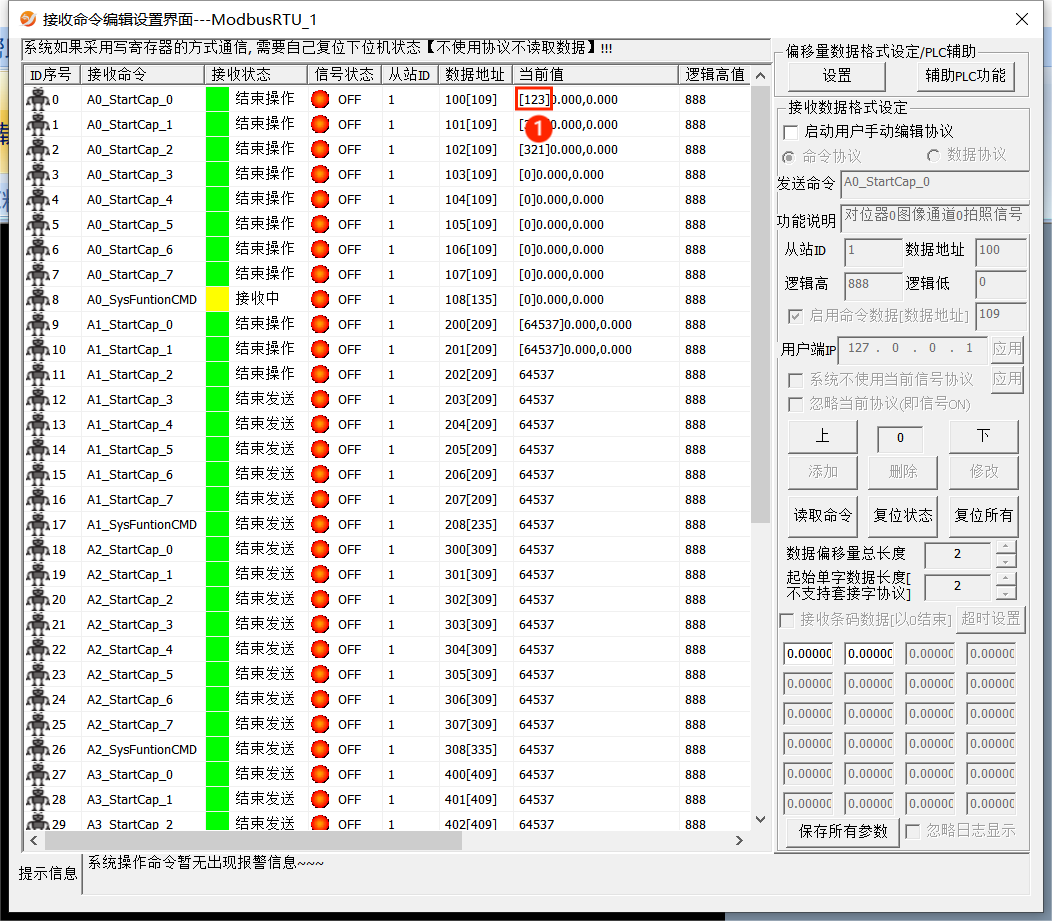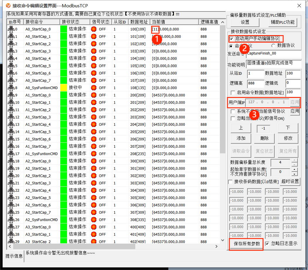 ①是PLC發(fā)送過來,視覺接收到的數(shù)據(jù),點擊②之后才能進(jìn)行編輯右邊的數(shù)據(jù),要保證③IP地址和PLC的地址一樣,修改后點擊下面“保存所有參數(shù)”保存,然后點擊②才可以退出③