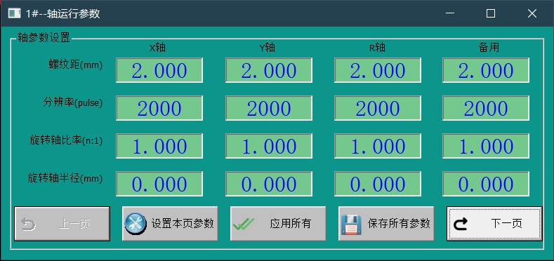2、分辨率:填入該軸的驅(qū)動器分辨率、細分;旋轉(zhuǎn)軸比例:填入“1“