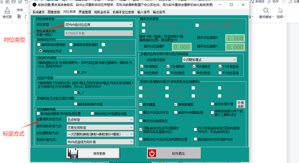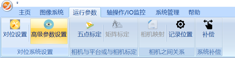 運行參數(shù)包括對位設(shè)置、高級參數(shù)設(shè)置、五點標定、補償。