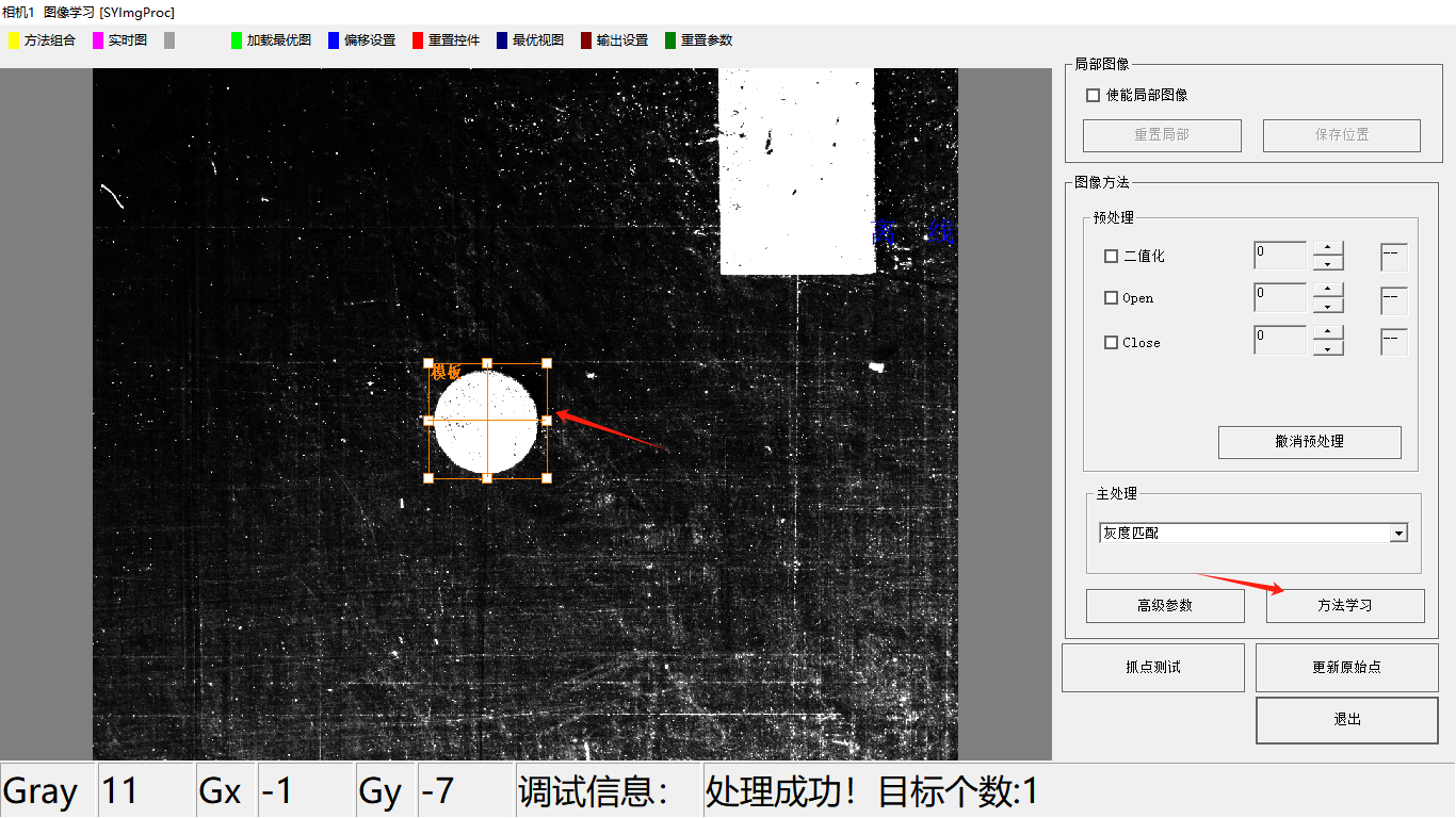 2、下拉重新選擇“灰度匹配”,黃色的模板框工具則會顯示出來,調(diào)整模板框位置和大小到合適,再點擊“方法學(xué)習(xí)”,則學(xué)習(xí)記錄當前的模板。