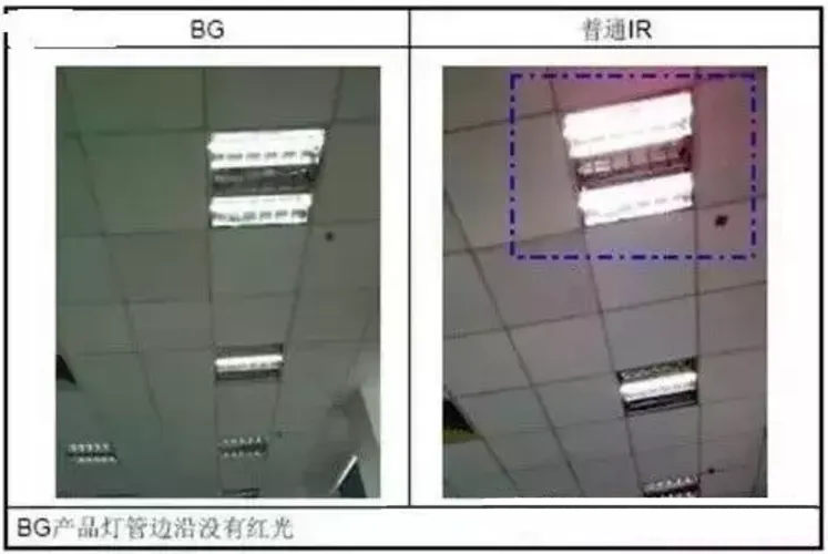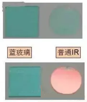 IR cut filter分為反射式(普通IR)及吸收式(藍(lán)玻璃)兩種。下圖在不同光線下可看到兩者的區(qū)別: