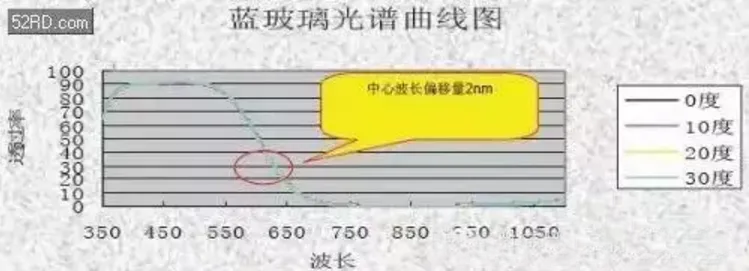 普通IR中心波長(zhǎng)偏移量在入射角0°~30°,偏移30nm左右,會(huì)形成色彩不均勻現(xiàn)象;藍(lán)玻璃IR中心波長(zhǎng)偏移量在入射角0°~30°,偏移2nm左右,不會(huì)出現(xiàn)黑角及紅斑現(xiàn)象。