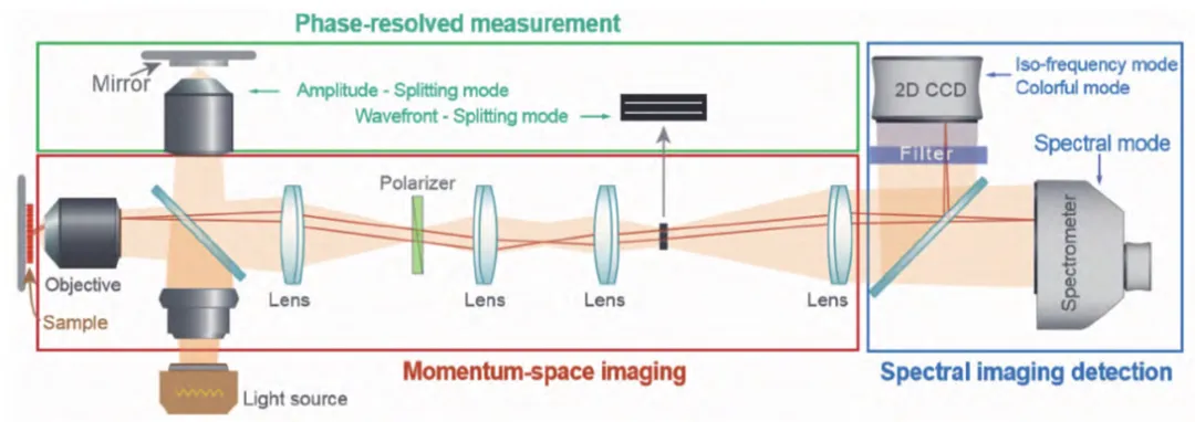 傅里葉平面成像利用光學(xué)透鏡進行光學(xué)傅里葉變換來獲得動量空間信息,而不是數(shù)值傅里葉變換,它不需要逐個位置掃描或角度掃描,并且適用于尺寸較微小的樣品。例如動量空間成像光譜(MSIS)系統(tǒng),該系統(tǒng)由動量空間成像模塊、光譜成像探測模塊和相位分辨測量模塊三部分組成。其中動量空間成像模塊和樣品散射光接收光路中均使用傅里葉平面成像法,傅里葉平面成像法能夠快速并同時獲取各個角度的光譜,但該方法受到物鏡數(shù)值孔徑的限制。