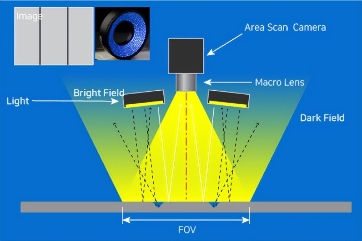 暗場法是一種使用散射光的測量方法。當光線照射到某個物體時,它會引起散射和反射,可以說它是一種利用這種散射光快速確定結(jié)構存在與否的方法。該結(jié)構在透鏡的視角(FOV)之外(主要在0~45度之間)安裝激光源,當光線照射時,散射光進入透鏡并識別物體。結(jié)構變亮,不存在的部分顯得很暗。當然,分辨率低于反射(Bright)類型,因為使用了散射光,但是可以快速拾取圖案邊緣的形狀,因此Fab里主要用暗場而不是明場。暗場中使用的光源使用波長比亮波長長的紫外線。