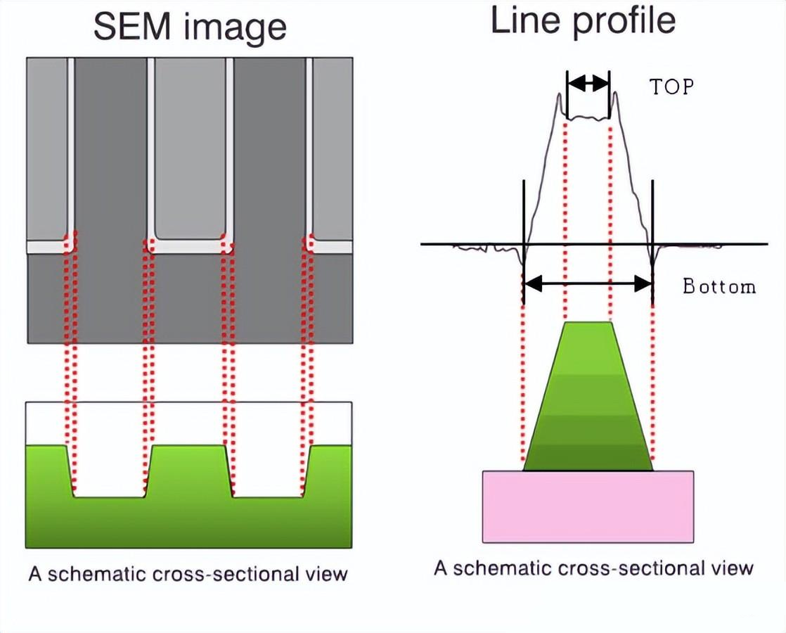 光刻膠線的橫截面圖與SEM圖像之間的關(guān)系(如下左圖);如果線橫截面(如下右圖)所示呈梯形,則頂部和底部的寬度將不同。在這種情況下,需要在上面提到的recipe程序中指定測(cè)量的位置及高度位置。