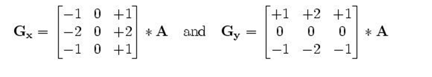 該算子包含兩組3x3的矩陣,分別為橫向及縱向,將之與圖像作平面卷積,即可分別得出橫向及縱向的亮度差分近似值。如果以A代表原始圖像,Gx及Gy分別代表經(jīng)橫向及縱向邊緣檢測(cè)的圖像灰度值,其公式如下: