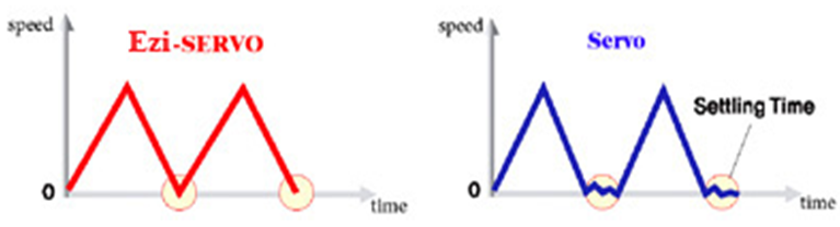 如同一般常見的步進(jìn)馬達(dá),Ezi-SERVO有非常好的同步性,接受命令PULSE,非??焖俚姆磻?yīng)達(dá)到定位的動(dòng)作,Ezi-SERVO的特性是使用在短距離快速定位的應(yīng)用,尤其如果是用傳統(tǒng)的伺服馬達(dá),它接受命令之后會(huì)有一個(gè)補(bǔ)償?shù)难舆t時(shí)間,所以它必須等待定位完了之后,才能執(zhí)行下面一個(gè)動(dòng)作,這個(gè)動(dòng)作我們稱為"整定時(shí)間"。