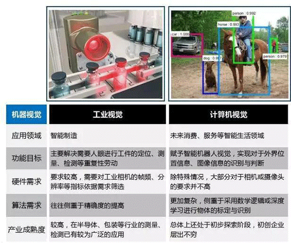 在產(chǎn)業(yè)成熟度上,工業(yè)視覺已經(jīng)相對較為成熟,在半導(dǎo)體、包裝等行業(yè)的測量檢測已有較為廣泛的應(yīng)用;而計算機(jī)視覺整體來講還是一個剛起步的狀態(tài),初創(chuàng)企業(yè)層出不窮。