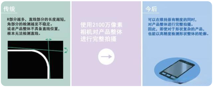 1.R部分較多的產(chǎn)品,角部分的檢測不穩(wěn)定,位置檢測也不穩(wěn)定。只要用2100萬像素相機對產(chǎn)品整體進行完整拍攝,即使形狀復(fù)雜,也能實現(xiàn)高精度的輪廓檢測。對于形狀多樣的產(chǎn)品,也能實現(xiàn)高精度的對準。