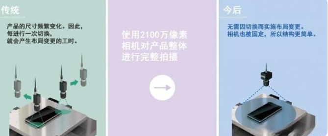 2.同一生產(chǎn)線上會生產(chǎn)多種產(chǎn)品,存在切換的麻煩。所用的相機分辨率較低時,要實現(xiàn)目標精度,就必須將拍攝視野變窄。所以,在同一生產(chǎn)線上實施多項生產(chǎn)時,每進行一次切換,會同時產(chǎn)生相機布局變更的工時。但只要用2100萬像素相機對產(chǎn)品整體進行完整拍攝,就能免除切換的工時,可固定使用相機,能夠構(gòu)建起簡單的生產(chǎn)系統(tǒng)。此外,可以統(tǒng)一進行多種產(chǎn)品的檢測。