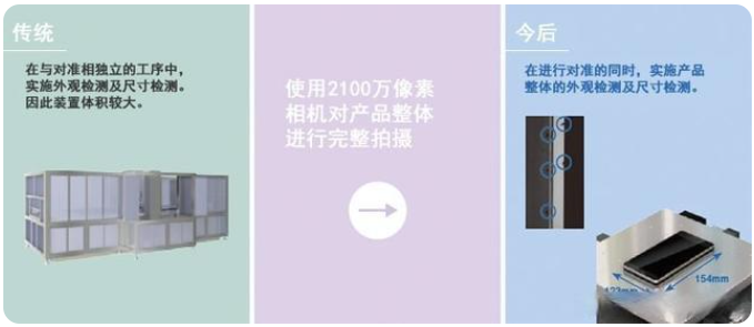 3.在與對準相獨立的工序中,實施利用視覺系統(tǒng)的外觀/尺寸檢測 。除了對準,在其他獨立工序中實施外觀檢測及尺寸檢測的案例還有很多,只要用2100萬像素相機對產(chǎn)品整體進行完整拍攝,就能同時進行對準和產(chǎn)品的整體外觀檢測。最終有助于減小生產(chǎn)設(shè)備的體積。
