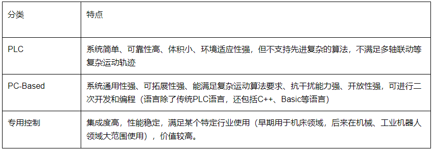 此時(shí),控制器的種類開始層出不窮,目前控制器有三種主要的控制方式:PLC控制、專用控制、PC-Based控制等,其特點(diǎn)如表1.