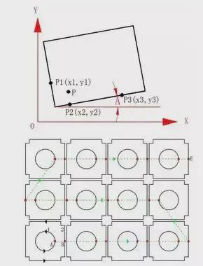 啟動自動尋邊功能后,切割頭從P點出發(fā),自動測得板料兩垂直邊上的3點:P1、P2、P3,并據(jù)此自動計算出板料的傾斜角度A,以及板料的原點。