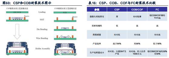MOB和MOC芯片封裝技術:在封裝環(huán)節(jié)推動前置CCM小型化,有望加速滲透 新型MOB和MOC封裝技術相比傳統(tǒng)的COB等封裝方式能夠減小模組尺寸。目前攝像頭芯片封裝有CSP(Chip Size Package)、COB(Chip On Board)、COF (Chip On FPC)和FC(Flip Chip)技術四種,隨著手機攝像頭像素越來越高,主要用于800萬像素以下的CSP技術地位下降,能夠實現(xiàn)更高圖像質(zhì)量的COB、COF/FC更受青睞。采用FC封裝得到的模組會薄1mm,但成本也較高。但在全面屏趨勢下,需要有新的技術將攝像頭模組做的更小。